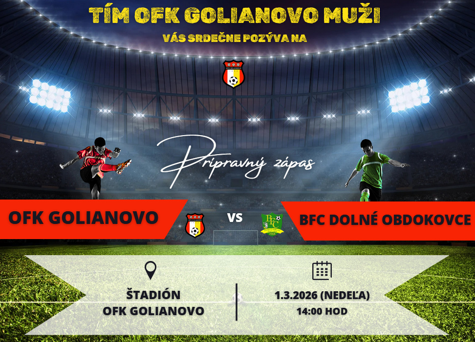 OFK Golianovo pozýva všetkých fanúšikov na generálku pred začiatkom jarnej časti. V domácom prostredí v nedeľu o 14:00 h. privítame Dolné Obdokovce. Ste našim 12 hráčom, príďte si užiť na štadión OFK peknú slnečnú nedeľu. Ďakujeme Vám za vašu podporu.