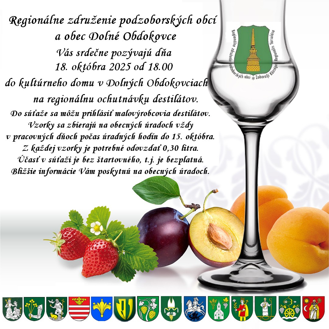 V mene Regionálneho združenia podzoborských obcí, Vás srdečne pozývame na ochutnávku kvalitných destilátov, ktorá sa uskutoční 18. októbra 2025 (v sobotu) od 18.00 hod. v Kultúrnom dome v Dolných Obdokovciach. Viac informácií nájdete v prílohe.